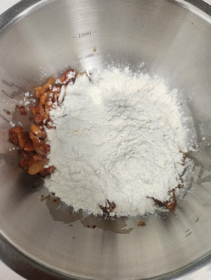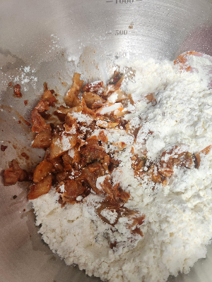3. 이상태에서 설탕, 새우가루를 첨가해줍니다. 설탕은 신김치를 중화해주는 역할과 감칠맛을 더해주는 역할을 합니다. 또, 새우가루도 해산물이 들어가지 않았지만, 해산물이 들어간 효과와 깊은 맛을 느낄 수 있게 도와줍니다.