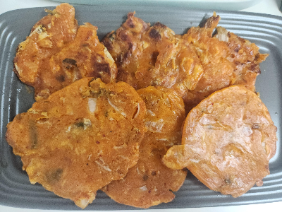 김치(신김치), 설탕, 보리새우간것(새우가루), 올리브오일, 부침가루,튀김가루, 차가운물