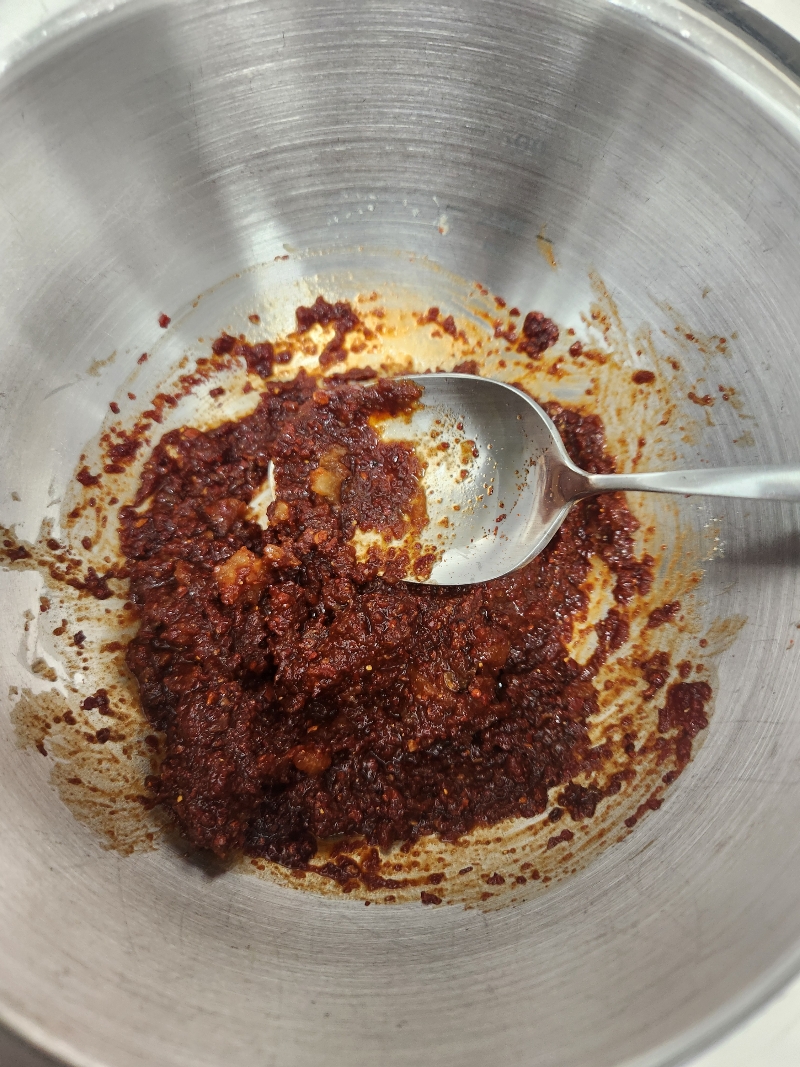 4. 고추가루7스푼, 소금조금, 새우가루, 매실액2스푼, 미림2스푼, 간장3스푼, 된장조금, 액젓2스푼, 생강조금, 마늘1스푼으로 양념장을 만들어서 냄비 가운데 올려줍니다.