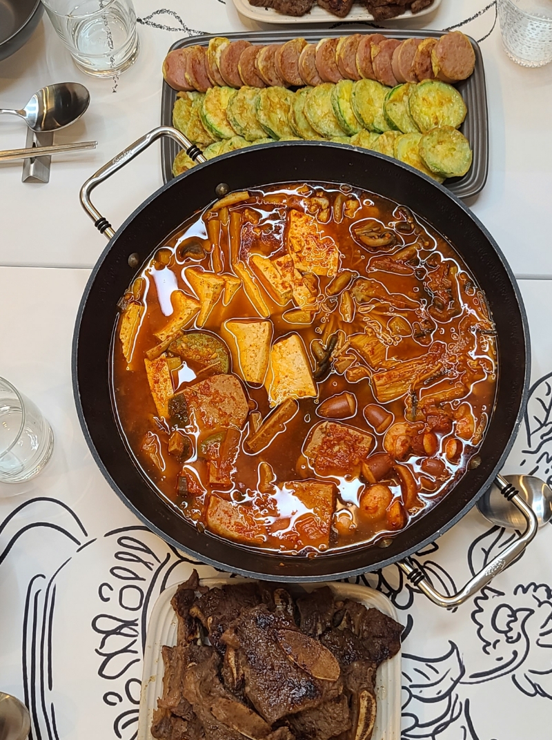 햄,소세지,스팸 등(햄을준비), 호박,당근,버섯(종류별로), 두부, 파, 김치, 돼지고기다짐육, 사골육수, 다진마늘 여기에 추가로 베이크드빈스같은 콩통조림이있다면 넣어주면 좋습니다(저는 거의 생략하긴 합니다)