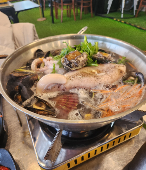 그리고, 해물전골도 가성대비 정말 좋았어요. 안에 해산물이 가득히 들어가있고 먹을 때마다 아주 끊임없이 나와서 원없이 홍함,조개,오징어,전복,가리비 등을 먹은 거 같아요. 국물이 얼큰하게 먹기 좋아서 아이도 후루룩 후루룩 잘 먹었어요. 매운건 잘 못먹는데 맵지 않으면서 맛있는 국물 맛이였어요.